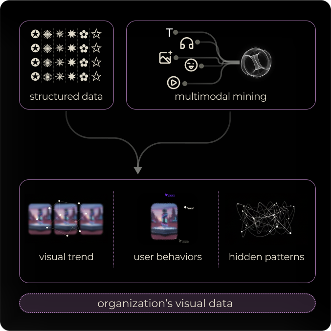 Combine enterprise structured data with multimodal mining to uncover visual trends, user attributes, and hidden patterns within organizations' visual data.